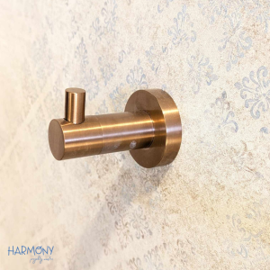 Charakter tej łazience nadają miedziane dodatki, które wprowadzają odrobinę luksusu i ciepła. Szczególną uwagę przykuwają baterie marki Omnires w wykończeniu miedzi szczotkowanej. Ich delikatny połysk pięknie komponuje się zarówno z mikrocementem, jak i kremowymi płytkami, dodając wnętrzu wyjątkowej elegancji.